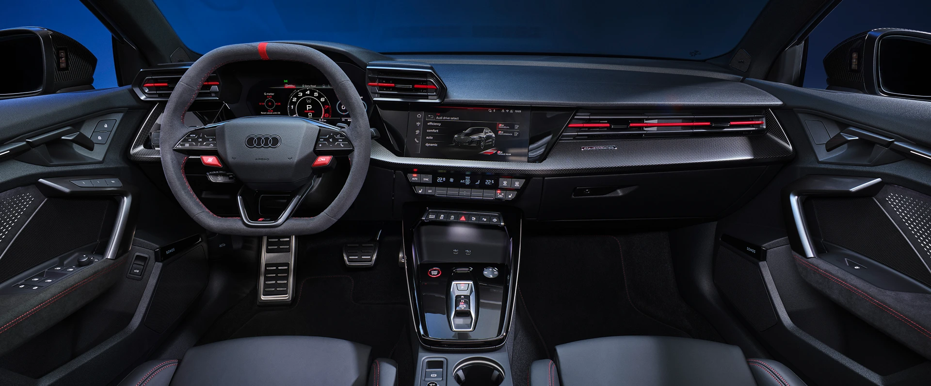 O interior é visivelmente esportivo com o pacote de design RS Vermelho, bancos dianteiros esportivos e volante esportivo achatado. A abordagem da dinâmica de condução também é claramente visível no Audi virtual cockpit plus com um design dos modelos RS selecionável.